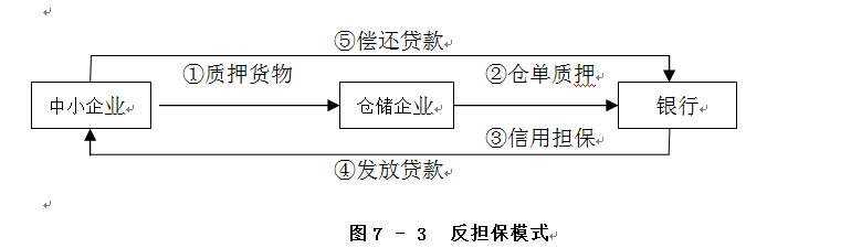 對于某些以寄存在倉儲企業(yè)倉庫中的貨物向銀行申請倉單融資仍有困難的中小企業(yè),可以通過反擔保模式得到貸款。該模式需要大型倉儲企業(yè)構建中小企業(yè)信用擔保體系,倉儲企業(yè)以中小企業(yè)寄存的貨物作為反擔保抵押物,通過擔保實現(xiàn)貸款;或者倉儲企業(yè)直接為中小企業(yè)申請倉單質(zhì)押貸款提供擔保,間接地提供中小企業(yè)信用。具體操作流程如圖7-3所示。
