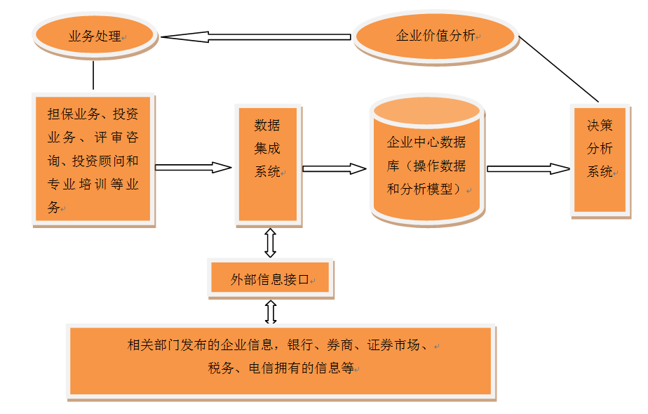 企業(yè)數(shù)據(jù)庫以企業(yè)中心數(shù)據(jù)庫為核心,還包括數(shù)據(jù)集成系統(tǒng)與決策分析系統(tǒng)。因此,企業(yè)數(shù)據(jù)庫的實施主要體現(xiàn)在企業(yè)業(yè)務(wù)和外部信息處理、企業(yè)數(shù)據(jù)集成系統(tǒng)、數(shù)據(jù)倉庫和決策分析系統(tǒng)四大部分。正如圖8-2所示,建立企業(yè)數(shù)據(jù)庫的目的最終體現(xiàn)在進(jìn)行企業(yè)價值分析,以便更有效地開展業(yè)務(wù)上。