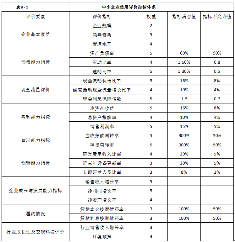 倉儲金融業(yè)務(wù)中,中小企業(yè)篩選的標(biāo)準(zhǔn)要根據(jù)國家對于中小型企業(yè)發(fā)展的指導(dǎo)思想,即“選擇重點,規(guī)范操作,總結(jié)經(jīng)驗,翁不推進(jìn)”與“支持發(fā)展與防范風(fēng)險相結(jié)合;政府扶持與市場操作相結(jié)合;開展擔(dān)保與提高信用相結(jié)合”的三個原則要求,結(jié)合企業(yè)的實際情況對中小型企業(yè)進(jìn)行篩選。倉儲金融業(yè)務(wù)是一項新業(yè)務(wù),為有效規(guī)避風(fēng)險,銀行對企業(yè)的審查相對嚴(yán)格,獲得批準(zhǔn)者一般都是各項業(yè)務(wù)素質(zhì)比較優(yōu)良的企業(yè)。比如廣東發(fā)展銀行在審貨時,一般選取行業(yè)市場占有率位于前三位的企業(yè),而且產(chǎn)品暢銷、價格穩(wěn)定、流通性好,同時也考慮企業(yè)的財務(wù)狀況、實力、品牌知名度等,目的是控制好信貸風(fēng)險。與傳統(tǒng)信貸業(yè)務(wù)的審查不同,倉儲金融業(yè)務(wù)對所服務(wù)的周末和小型企業(yè)的審核更強(qiáng)調(diào)企業(yè)的成長性,這涉及該企業(yè)的還款來源。此外,經(jīng)營管理團(tuán)隊、產(chǎn)品及其技術(shù)含量、市場等也是審查的重點。對中小型企業(yè)的信用評價指標(biāo)體系如表8-1所示,評價的要素包括企業(yè)基本要素、賠償能力指標(biāo)、現(xiàn)金流量評價、盈利能力指標(biāo)、營運能力指標(biāo)、創(chuàng)新能力指標(biāo)、企業(yè)成長與發(fā)展能力指標(biāo)、履約情況、行業(yè)成長性與宏觀環(huán)境評價。